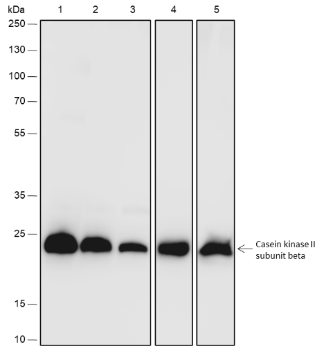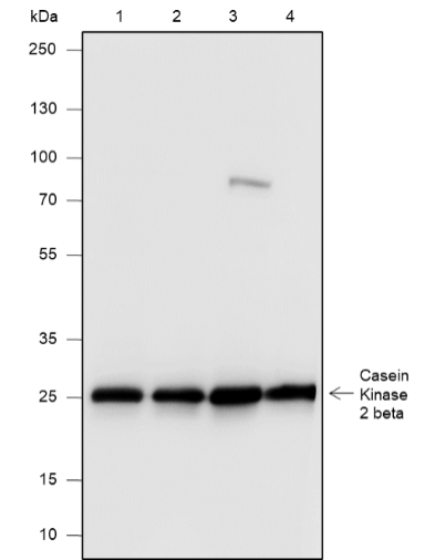 Casein Kinase 2 beta is a ubiquitous protein kinase which regulates metabolic pathways, signal transduction, transcription, translation, and replication. The enzyme is composed of three subunits, alpha, alpha prime and beta, which form a tetrameric holoenzyme. The alpha and alpha prime subunits are catalytic, while the beta subunit serves regulatory functions. The enzyme localizes to the endoplasmic reticulum and the Golgi apparatus. It participates in Wnt signaling, and plays a complex role in regulating the basal catalytic activity of the alpha subunit.