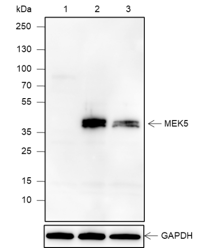 MEK5 is a dual specific kinase that specifically activates ERK5 involved in the regulation of diverse cellular processes, including cell growth, survival, and differentiation. The MEK5-ERK5 pathway is activated in numerous cancer types and plays a role in tumor growth and metastasis. Pharmacological targeting of the MEK5-ERK5 pathway has been investigated as a strategy for cancer treatment. MEK5 is activated by a variety of stimuli, including growth factors, cytokines, and oxidative stress. Activation of MEK5 is triggered by upstream kinases MEKK2 and MEKK3, leading to phosphorylation of MEK5 at Ser311 and Thr315, which subsequently leads to MEK5 dependent phosphorylation of EKR5 at Thr218 and Tyr220. Phosphorylation of ERK5 leads to nuclear translocation and regulation of several oncogenic transcription factors, including MEF2C, c-Fos, c-Myc, and Sap1.