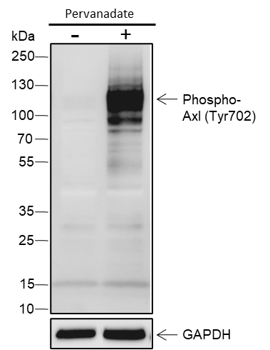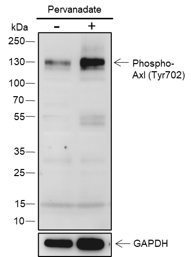 Axl, also known as Ufo or Ark, is a member of receptor tyrosine kinase of the TAM family. Axl is a single-pass type I membrane protein containing two fibronectin type-III domains, two Ig-like C2-type domains and one protein kinase domain. Axl mRNA is widely expressed with highest levels in the heart and skeletal muscle. Gas6 has been identified as a ligand for human Axl. Gas6/Axl signaling plays a role in cell survival, cell proliferation, migration and differentiation. This antibody detects a single band at 140 kDa, which is considered to represent the auto-phosphorylated form of endogenous Axl.Phosphorylation of Axl on Tyr702 was also reported in select carcinoma cell lines.