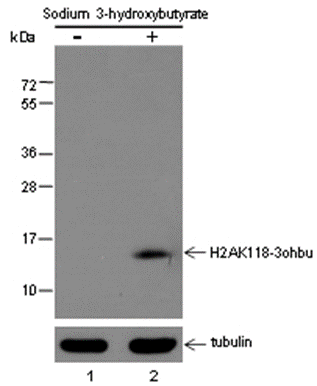 Specificity Anti-β-Hydroxybutyrylated-Histone H2A (Lys118) Rabbit pAb detects histone H2A only when it is β-hydroxybutyrylated at Lys118.