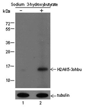 Specificity Anti-β-Hydroxybutyrylated-Histone H2A (Lys5) Rabbit pAb detects histone H2A only when it is β-hydroxybutyrylated at Lys5.