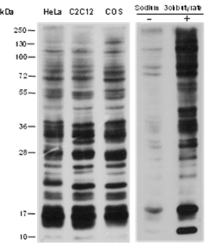 Lysates: HeLa, C2C12, COS, (-) HeLa, (+) HeLa + sodium 3-hydroxybutyrate (100 mM, 72 hours) |