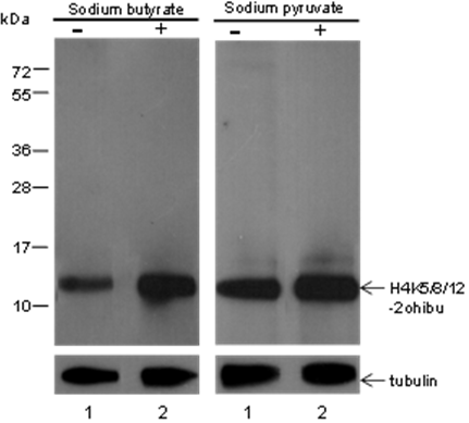 Lysate: (Left) HeLa±Sodium butyrate (30mM, 4hr), (Right) HeLa±Sodium pyruvate (100mM, 72hr)