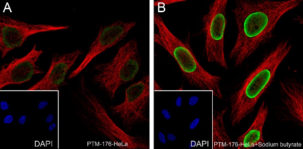 Samples: (A) HeLa cells; (B) HeLa cells treated with 30 mM sodium butyrate for 4 hours