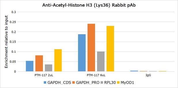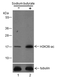 Specificity Anti-Acetyl-Histone H3 (Lys36) Rabbit pAb detects histone H3 only when it is acetylated at Lys36. This antibody has been shown to selectively recognize acetylated H3 peptide at Lys36, but not the unmodified peptide.