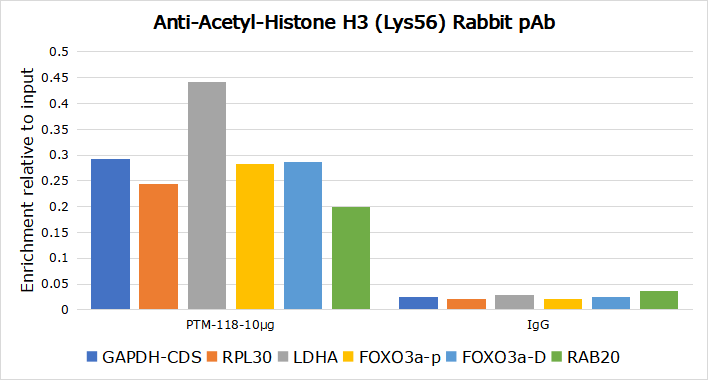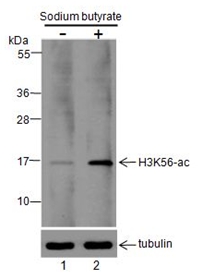 Specificity Anti-Acetyl-Histone H3 (Lys56) Rabbit pAb detects histone H3 only when it is acetylated at Lys56. This antibody has been shown to selectively recognize acetylated H3 peptide at Lys56, but not the structurally similar crotonylated or unmodified H3 peptide.
