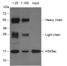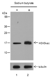 Specificity Anti-Acetyl-Histone H3 (Lys9) Rabbit pAb detects histone H3 only when it is acetylated at Lys9. This antibody has been shown to selectively recognize acetylated H3 peptide at Lys9, but not the structurally similar butyrylated or crotonylated H3 peptide at Lys9.
