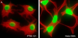 Description: The green color represents the positive signal observed with PTM-121.