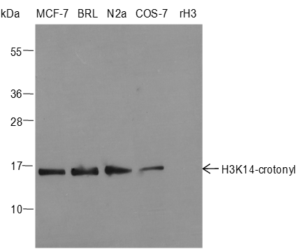 Histones are subject to a variety of enzyme catalyzed modifications, including acetylation, methylation, phosphorylation, ubiquitylation, etc. Crotonylation of lysine is a newly identified reversible modification controlling chromosome structure and gene transcription. The reversible lysine crotonylation has been well demonstrated in eukaryotic histones from worm to human. The unique structure and genomic localization of histone lysine crotonylation suggest that it is mechanistically and functionally different from histone lysine acetylation. Specifically, in both human somatic and mouse male germ cell genomes, histone crotonylation marks either active promoters or potential enhancers. Crotonylation of histone H3 at Lys14 may play a vital role in the epigenetic modulation, including chromatin remodeling and DNA transcriptional regulation.