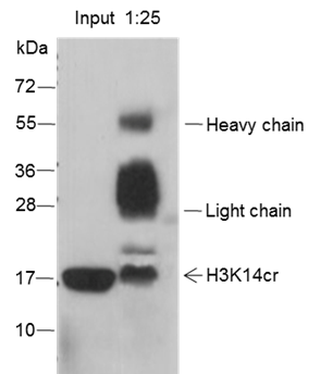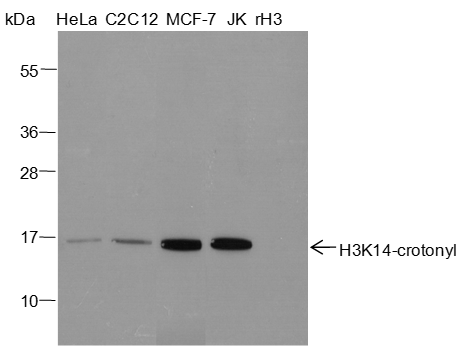 Histones are subject to a variety of enzyme catalyzed modifications, including acetylation, methylation, phosphorylation, ubiquitylation, etc. Crotonylation of lysine is a newly identified reversible modification controlling chromosome structure and gene transcription. The reversible lysine crotonylation has been well demonstrated in eukaryotic histones from worm to human. The unique structure and genomic localization of histone lysine crotonylation suggest that it is mechanistically and functionally different from histone lysine acetylation. Specifically, in both human somatic and mouse male germ cell genomes, histone crotonylation marks either active promoters or potential enhancers. Crotonylation of histone H3 at Lys14 may play a vital role in the epigenetic modulation, including chromatin remodeling and DNA transcriptional regulation.