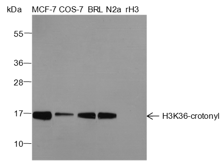 Histones are subject to a variety of enzyme catalyzed modifications, including acetylation, methylation, phosphorylation, ubiquitylation, etc. Crotonylation of lysine is a newly identified reversible modification controlling chromosome structure and gene transcription. The reversible lysine crotonylation has been well demonstrated in eukaryotic histones from worm to human. The unique structure and genomic localization of histone lysine crotonylation suggest that it is mechanistically and functionally different from histone lysine acetylation. Specifically, in both human somatic and mouse male germ cell genomes, histone crotonylation marks either active promoters or potential enhancers. Crotonylation of histone H3 at Lys36 may play a vital role in the epigenetic modulation, including chromatin remodeling and DNA transcriptional regulation.