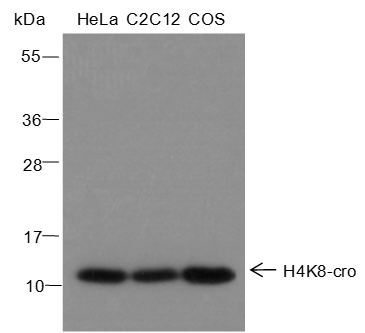| Specificity | Anti-Crotonyl-Histone H4 (Lys8) Rabbit mAb detects histone H4 only when it is crotonylated at Lys8. |