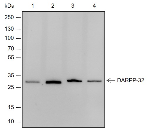DARPP-32 (dopamine and cyclic AMP-regulated phosphoprotein, relative molecular mass 32,000) is a cytosolic protein highly enriched in medium-sized spiny neurons of the neostriatum. It is a bifunctional signaling molecule that controls serine/threonine kinase and serine/threonine phosphatase activity. Dopamine stimulates phosphorylation of DARPP-32 through D1 receptors and activation of PKA. PKA phosphorylation of DARPP-32 at Thr34 converts it into an inhibitor of protein phosphatase 1. DARPP-32 is converted into an inhibitor of PKA when phosphorylated at Thr75 by cyclin-dependent kinase 5 (CDK5). Mice containing a targeted deletion of the DARPP-32 gene exhibit an altered biochemical, electrophysiological, and behavioral phenotype.
