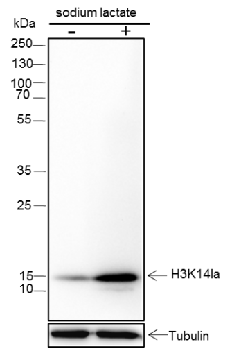 Specificity Anti-L-Lactyl-Histone H3 (Lys14) Rabbit mAb detects endogenous levels of histone H3 when it is lactylated at Lys14.