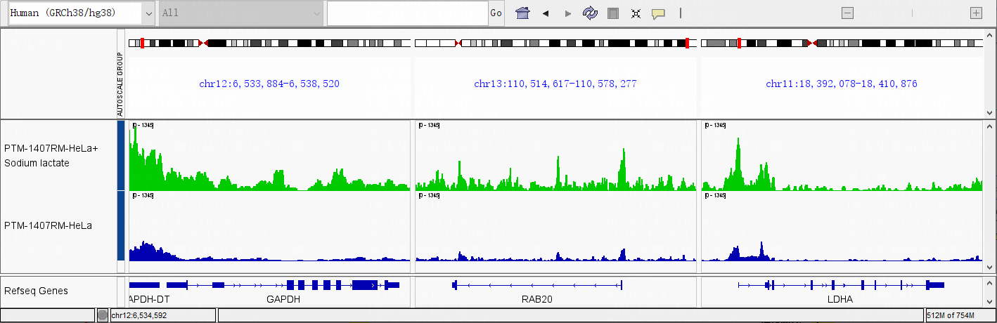 Description: Genomic visualization of CUT&Tag sequencing results from Normal Rabbit IgG negative control and Anti-LLactyl-Histone H4 (Lys5) Rabbit mAb (PTM1407RM). There are significant H4K5la signal enrichments at the regions of GAPDH, RAB20, LDHA. The DNA Libraries were sequenced by Illumina NovaSeq platform (PE 150) and the sequencing deep was 27 M reads/sample.