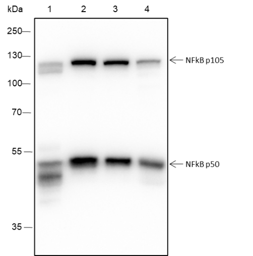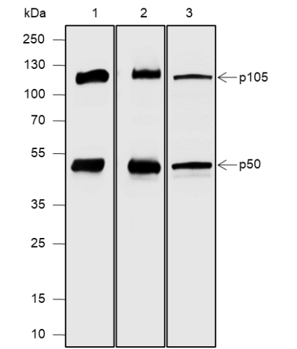 NFKB is a pleiotropic transcription factor present in almost all cell types and is the endpoint of a series of signal transduction events that are initiated by a vast array of stimuli related to many biological processes such as inflammation, immunity, differentiation, cell growth, tumorigenesis and apoptosis. NFKB is a homo- or heterodimeric complex formed by the Rel-like domain-containing proteins RELA/p65, RELB, NFKB1/p105, NFKB1/p50, REL and NFKB2/p52 and the heterodimeric p65-p50 complex appears to be most abundant one. The dimers bind at kappa-B sites in the DNA of their target genes and the individual dimers have distinct preferences for different kappa-B sites that they can bind with distinguishable affinity and specificity.