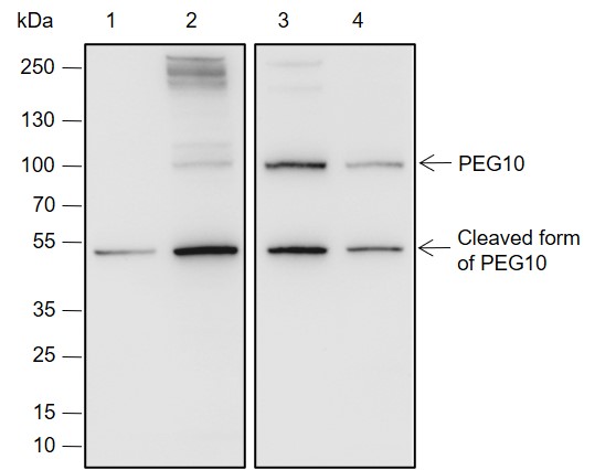 Paternally expressed gene 10(PEG10 ) is an imprinted gene which is derived from a Ty3/Gypsy long terminal repeat (LTR) retrotransposon family encoding Gag- and Pol-like domains. Deletion of PEG10 in mice leads to embryonic lethality due to defects in placental formation. PEG10 is aberrantly expressed in several cancer types, including hepatocellular carcinoma, and contributes to tumorigenesis by affecting cell proliferation, apoptosis, and metastasis. The PEG10 gene has two overlapping open reading frames that are regulated by the programmed process of -1 frameshifting. The first encoded protein ORF1 (or RF1) has a Gag domain with coiled-coil domain and zinc finger domains, while ORF1-2 (or RF1/RF2) is produced by -1 frameshifting and creates a fusion of the ORF1 Gag domain with a carboxyl-terminal Pol-like protease domain. PEG10 has retained the ability to form virus-like particles (VLPs) that are secreted as small extracellular vesicles delivered to distant sites.