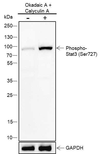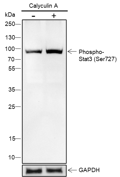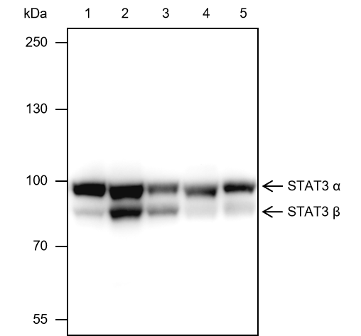 The STAT3 transcription factor is an important signaling molecule for many cytokines and growth factor receptors and is required for murine fetal development. Research studies have shown that STAT3 is constitutively activated in a number of human tumors and possesses oncogenic potential and anti-apoptotic activities. STAT3 is activated by phosphorylation at Tyr705, which induces dimerization, nuclear translocation, and DNA binding. Transcriptional activation seems to be regulated by phosphorylation at Ser727 through the MAPK or mTOR pathways. STAT3 isoform expression appears to reflect biological function as the relative expression levels of STAT3α (86 kDa) and STAT3β (79 kDa) depend on cell type, ligand exposure, or cell maturation stage. It is notable that STAT3β lacks the serine phosphorylation site within the carboxy-terminal transcriptional activation domain.