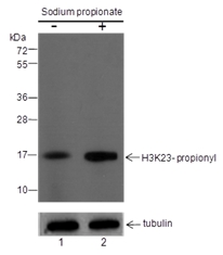 Histones are subject to a variety of enzyme-catalyzed modifications, including acetylation, methylation, phosphorylation, ubiquitylation, and others. Among these modifications, lysine propionylation (Kpr) has emerged as a newly identified reversible modification that plays a crucial role in controlling protein activity. Structurally similar to lysine acetylation, lysine propionylation is prevalent in both prokaryotes and eukaryotes and has been identified in a wide range of proteins, including histones and non-histone substrates like p53. Recent research has unveiled the involvement of stoichiometric complexes comprising lysine acetyltransferase 6A (KAT6A), KAT6B, and bromodomain- and PHD finger-containing protein 1 (BRPF1) in the catalysis of histone H3 Lys23 propionylation (H3K23pr). Importantly, deficiencies in histone propionylation have been associated with developmental disorders and cancer.