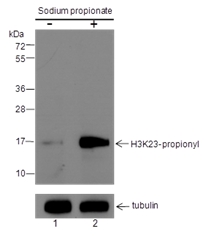 Histones are subject to a variety of enzyme-catalyzed modifications, including acetylation, methylation, phosphorylation, ubiquitylation, and others. Among these modifications, lysine propionylation (Kpr) has emerged as a newly identified reversible modification that plays a crucial role in controlling protein activity. Structurally similar to lysine acetylation, lysine propionylation is prevalent in both prokaryotes and eukaryotes and has been identified in a wide range of proteins, including histones and non-histone substrates like p53. Recent research has unveiled the involvement of stoichiometric complexes comprising lysine acetyltransferase 6A (KAT6A), KAT6B, and bromodomain- and PHD finger-containing protein 1 (BRPF1) in the catalysis of histone H3 Lys23 propionylation (H3K23pr). Importantly, deficiencies in histone propionylation have been associated with developmental disorders and cancer.
