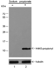 Histones are subject to a variety of enzyme catalyzed modifications, including acetylation, methylation, phosphorylation, ubiquitylation, etc. Lysine propionylation (Kprop) is structurally similar to lysine acetylation, is a newly identified reversible modification controlling protein activity. Lysine propionylation is abundant in both prokaryotes and eukaryotes and has been found in wide ranges of proteins including histones and non-histone substrates, such as p53. Similar to acetylation of histione H3 at Lys12, propionylation of histone H4 at Lys5 may play a vital role in the epigenetic modulation, including chromatin remodeling and transcriptional regulation.