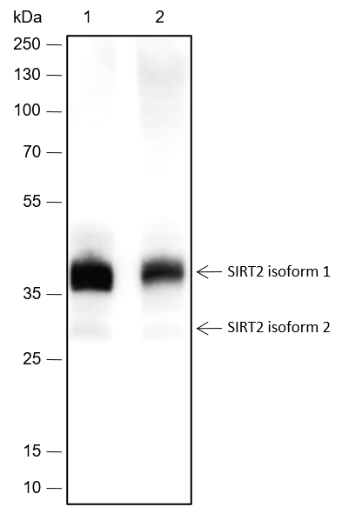 NAD-dependent protein deacetylase sirtuin-2 (SIRT2) is a NAD-dependent protein deacetylase, which deacetylates internal lysines on histone and alpha-tubulin as well as many other proteins such as key transcription factors. SIRT2 participates in the modulation of multiple and diverse biological processes such as cell cycle control, genomic integrity, microtubule dynamics, cell differentiation, metabolic networks, and autophagy. SIRT2 plays a major role in the control of cell cycle progression and genomic stability. It also functions in the antephase checkpoint preventing precocious mitotic entry in response to microtubule stress agents, and hence allowing proper inheritance of chromosomes.