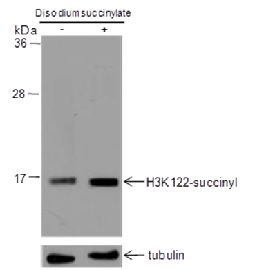 Histones are subject to a variety of enzyme catalyzed modifications including acetylation, phosphorylation, ubiquitylation etc. Lysine succinylation is a recently identified novel protein post-translational modification (PTM). Lysine succinylation is evolutionarily conserved and abundantly present in proteins in both prokaryotic and eukaryotic cells, suggesting its roles in regulating cellular physiology. This antibody will facilitate studies of lysine succinylation biology by identifying its substrates and studying its function.