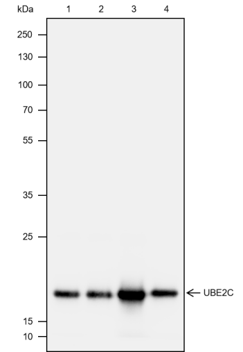 UBE2C is one of several ubiquitin conjugating enzymes participating in the E3 anaphase-promoting complex (APC/C). UBE2C is involved in the control of multiple stages of the cell cycle including inactivation of the mitotic spindle assembly checkpoint. UBE2C facilitates ubiquitin-dependent proteasomal degradation by initiating K11-linked ubiquitin chains on APC/C substrates. Research studies show that UBE2C expression is low in normal tissues, but its expression is dramatically upregulated in tumors derived from tissues such as lung, breast, and prostate. Overexpression of UBE2C in many types of solid tumors has been attributed to genomic amplification of the UBE2C locus and research studies have suggested that inhibition of UBE2C activity may have therapeutic potential.