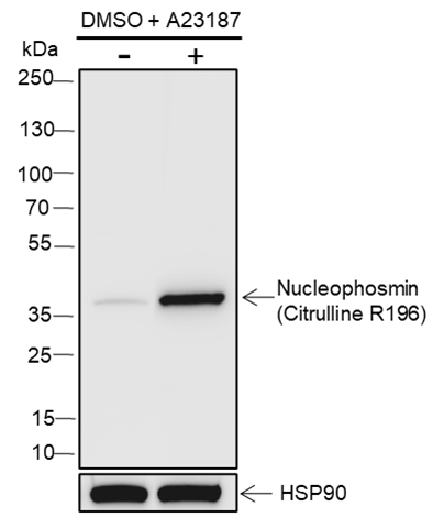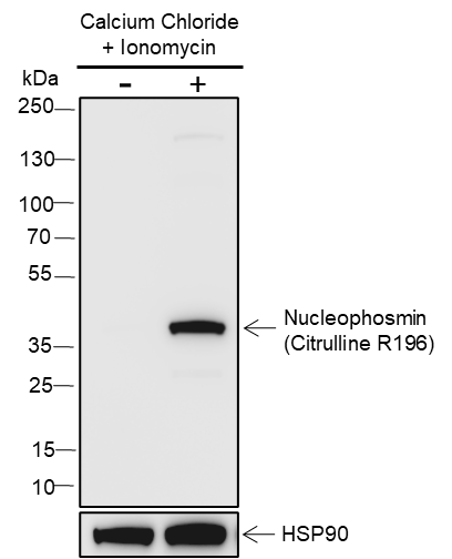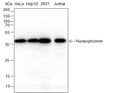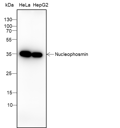 Nucleophosmin (NPM1) is a putative ribosome assembly factor with a high affinity for peptides containing nuclear localization signals (NLSs). The transport of proteins across the nuclear envelope is a selective, multistep process involving several cytoplasmic factors. Proteins must be recognized as import substrates, dock at the nuclear pore complex and translocate across the nuclear envelope in an ATP-dependent fashion. Several cytosolic and nuclear proteins that are central to this process have been identified. NPM1 is involved in ribosomal assembly and rRNA transport. It is highly phosphorylated by Cdc2 kinase during mitosis.