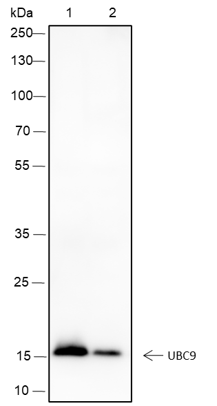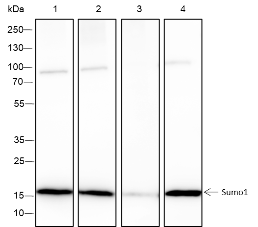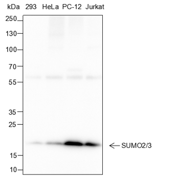 Small ubiquitin-related modifier 1, 2 and 3 (SUMO-1, 2 and 3) are members of the ubiquitin-like protein family. The functions of the small ubiquitin-related modifier protein is similar to ubiquitin in that it is bound to target proteins as part of a post-translational modification system. It can be covalently attached to proteins as a monomer or a lysine-linked polymer. Covalent attachment via an isopeptide bond to its substrates requires prior activation by the E1 complex SAE1-SAE2 and linkage to the E2 enzyme UBE2I and can be promoted by E3 ligases such as PIAS1-4, RANBP2 or CBX4. Ubiquitin predominantly regulates degradation of its target. In contrast, SUMO-1 is conjugated to RanGAP, PML, p53 and IκB-α to regulate nuclear trafficking, formation of subnuclear structures, transcriptional activity, and protein stability. SUMO-2/3 forms poly-(SUMO) chains, which is conjugated to topoisomerase II and APP, and regulates chromosomal segregation and cellular responses to environmental stress.